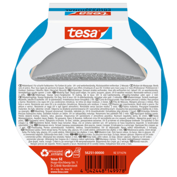 De Tesa Professional Outdoor schilderstape blauw 38 mm x 25 m is een extra brede afplaktape voor veeleisend schilderwerk op gladde en licht oneffen ondergronden buiten. De tape heeft een papieren drager en is UV-bestendig. Je scheurt de tape gemakkelijk met de hand af. De afplaktape is oplosmiddelvrij en verwijderbaar zonder lijmresten tot acht weken na het plakken. De tape is geschikt voor alle verftypes.