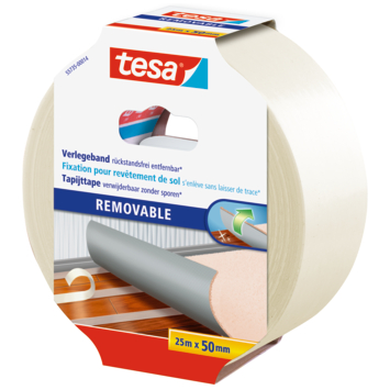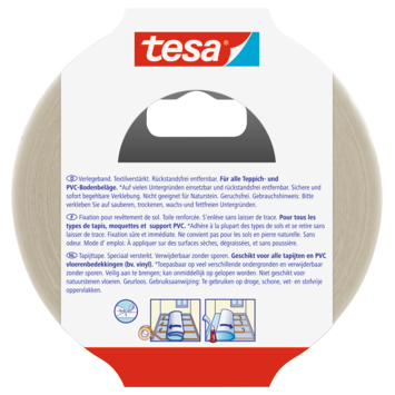 Tesa tapijttape verwijderbaar wit 25 m x 50 mm is een stevige dubbelzijdige tape die je binnen gebruikt voor het leggen van tapijt op zowel gladde als ruwe vloeren. De tape heeft een kunststof basis met een geweven structuur van PE wat hem sterk maakt en toch flexibel houdt. Je scheurt hem gewoon met de hand af en hij laat geen lijmsporen achter bij het verwijderen. Dat maakt deze tape handig voor tijdelijke of nette vloerafwerkingen.