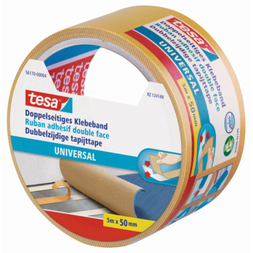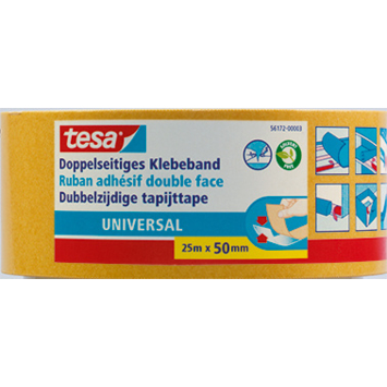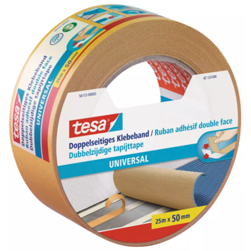 Tesa Universal dubbelzijdig kleefband 25 m x 50 mm is een montagetape die geschikt is voor effen en oneffen ondergronden binnenshuis. De tape heeft een kunststof drager en een rubberen kleeflaag. Je gebruikt deze tape bij het leggen van tapijt of voor decoratieve toepassingen in huis. Je kunt hem met de hand afscheuren wat het aanbrengen snel en makkelijk maakt. De tape hecht aan twee kanten zodat je eenvoudig materialen aan elkaar bevestigt zonder lijm of schroeven.