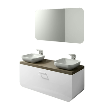 De Tiger badmeubel Ontario 105cm wit met spiegel heeft een strak witte hoogglans uitvoering en met de afgeronde hoeken heeft dit badkamermeubel een retro look. Op de kast ligt een art wood houten wastafelblad met twee witte keramieken waskommen, wat een mooi contrast geeft aan het geheel.