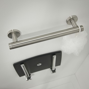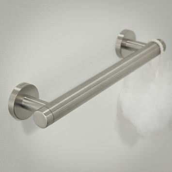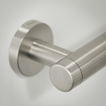 Mooie, strakke handgreep van geborsteld rvs. Een pareltje in de badkamer.