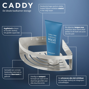 De Tiger Caddy hoekkorf klein rvs heeft een uniek 'fits to size' design. De randen van de hoekkorf sluiten hierdoor perfect aan op de muur, zelfs in die ene hoek die niet haaks is! Deze Caddy hoekkorf is uitgevoerd in RVS, maar is ook verkrijgbaar in verchroomd RVS. Tevens verkrijgbaar in anderen afmetingen en modellen. De serie van Tiger Caddy bestaat uit een selectie van korven in verschillende vormen, kleuren en afmetingen.