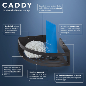 De Tiger Caddy Hoekkorf Zwart RVS heeft een uniek 'fits to size' design. De randen van de hoekkorf sluiten hierdoor perfect aan op de muur, zelfs in die ene hoek die niet haaks is! Deze Caddy hoekkorf is uitgevoerd in roestvrij staal met zwarte coating, maar is ook verkrijgbaar in verchroomd en geborsteld RVS. Tevens verkrijgbaar in anderen afmetingen en modellen. De serie van Tiger Caddy bestaat uit een selectie van korven in verschillende vormen, kleuren en afmetingen.