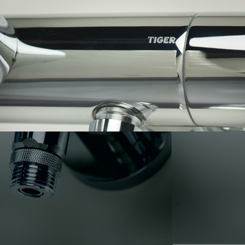 De Tiger doucheslang koppelstuk antitwist tussen de handdouche en de slang te monteren, krult de slang niet op. Dit product is onderdeel van het Tiger Splash assortiment, dat bestaat uit handdouches, doucheset, doucheslangen en toebehoren.
