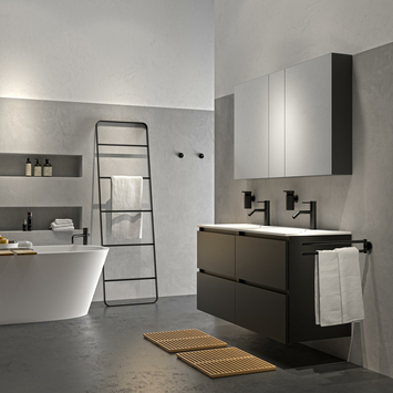 Daarnaast bestaat deze set uit twee matzwarte polybeton wastafels met natuursteen look. Tijdens het ontwerpproces van de waskommen is goed nagedacht over een juiste balans tussen design en functionaliteit. Polybeton wastafels zijn hygiënisch en gemakkelijk in onderhoud. De wastafel heeft twee externe overlopen en 2 kraangaten. Voor het overloopgat wordt een sierring in zowel chroom als zwart meegeleverd waardoor deze altijd mooi aansluit bij je badkameraccessoires.