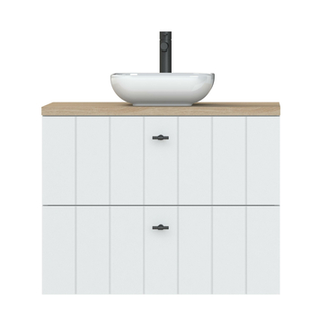 Landelijk design in een modern jasje. De Tiger Maryport wastafelonderkast van 80 cm in mat wit en licht eiken wasblad met voelbare houtnerf zorgt voor een luxe, sfeervolle look en houdt badkamer en geest opgeruimd. Deze volledig voorgemonteerde wastafelonderkast heeft 2 ruime lades met softclose geleiders om al je verzorgingsproducten overzichtelijk in op te bergen. De half voorgeboorde gaten voor de matzwarte grepen zorgen voor een eenvoudige montage. De look wordt compleet dankzij de afgeronde wit glanzende keramische opzetkom. Deze waskom is vrijwel onderhoudsarm, hygiënisch, krasvast en bestand tegen chemische middelen.