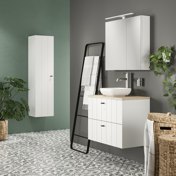 Creëer een verfijnde en elegante look met deze volledig voorgemonteerde Tiger Maryport hoge kolomkast in mat wit. Deze brede kolomkast van 40 cm heeft 4 witte, houten legplanken voor het opbergen van al je verzorgingsproducten en handdoeken. Bovendien zijn 3 legplanken in hoogte verstelbaar waardoor je de kastruimte volledig naar wens kunt indelen. De deur kan zowel links als rechts gemonteerd worden zodat hij in elke situatie past. Het half voorgeboorde greepgat voor de mat zwarte greep zorgt voor eenvoudige montage.