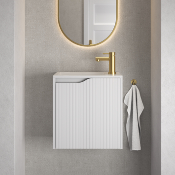 Deze mini wastafelmeubel van 50 cm is ideaal voor kleine badkamers of toiletten. Het compacte formaat houdt de ruimte overzichtelijk. glanzend wit geeft een lichte, frisse uitstraling en combineert goed met verschillende wandkleuren en accessoires. Zo blijft de badkamer ruimtelijk en functioneel.