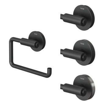Ervaar de veelzijdigheid van de Orion toiletrolhouder uit de Tiger serie! Deze houder is uitgevoerd in een chique matzwarte kleur en wordt geleverd met twee stijlvolle decorringen: één met een zwarte ribbelstructuur en één in gunmetal. Hiermee voeg je eenvoudig een subtiel accent toe aan je badkameraccessoire.