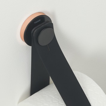 De Tiger Reserverolhouder Urban Zwart is uitgevoerd in de kleur mat zwart en wordt geleverd met twee decorringen. De decorringen, in de kleur koper en grijs, maken het mogelijk een subtiel kleuraccent toe te voegen. Het is ook mogelijk de toiletrolhouder zonder de decorring te monteren waardoor het zeer eenvoudig is om het product aan de gewenste stijl aan te passen. De flexibele band biedt plaats aan twee extra rollen toiletpapier zodat er altijd voldoende papier beschikbaar is. Bij de montage van het artikel wordt gebruik gemaakt van een muurplaatje waardoor de bijgeleverde bevestigingsmaterialen uit het zicht verdwijnen. De Urban serie bevat tevens een vrijstaande versie van de reserverolhouder, maar ook een groot aantal aanvullende accessoires voor de badkamer en toiletruimte. Alle in dezelfde stijl. De artikelen uit de serie zijn ook in de kleur mat wit verkrijgbaar, waarbij natuurlijk ook weer diverse decorringen worden meegeleverd. De reserverolhouder is tevens geschikt voor montage met TigerFix type 1, waarmee accessoires snel en eenvoudig op een gladde, harde ondergrond te bevestigen zijn door middel van een gepatenteerd lijmsysteem. Boren is niet noodzakelijk en de accessoires zijn eenvoudig te verwijderen zonder dat er resten op de ondergrond achterblijven. TigerFix is los verkrijgbaar.