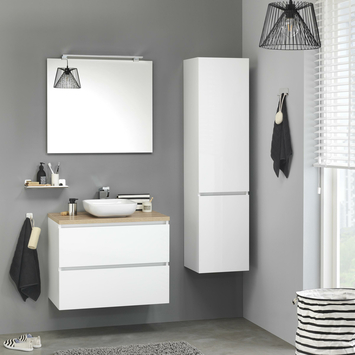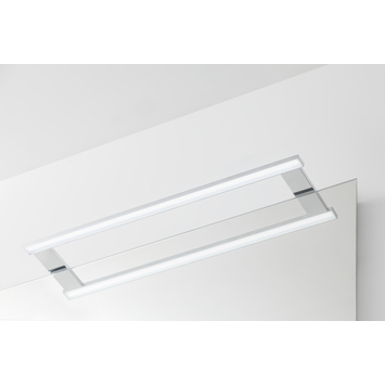 De Tiger Spiegelverlichting Helena Chroom 60 cm 6100 K is een moderne rechthoekige designlamp die je badkamer voorziet van helder licht. De Ledlamp met een lichtopbrengst van 950 Lumen voorziet je van het nodige licht bij het scheren of aanbrengen en verwijderen van make-up. Bovendien zorgt de lichtkleur van 6100 Kelvin voor een heldere belichting van de hele badkamer. Met de energiezuinige LEDlamp die slechts een verbruik heeft van 8,4 Watt en een levensduur van 20.000 branduren is deze spiegellamp een zeer economische aankoop. De lamp is vocht- en corrosie bestendig en IP44 bestendig tegen spattend water boven de wastafel. Door de geïntegreerde transformator is deze spiegellamp direct aan te sluiten op het lichtnet. Monteerbaar bovenop (spiegel)kast of kolomkast.