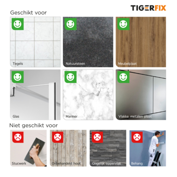 Met TigerFix zijn Tiger accessoires snel en eenvoudig op een gladde, harde ondergrond te bevestigen door middel van een gepatenteerd lijmsysteem. Je badkamer verfraaien met Tiger accessoires was nog nooit zo eenvoudig. Na het mixen van de lijm kan deze eenvoudig op het muurplaatje worden aangebracht en na 4 uur kun je het accessoire plaatsen. Zo simpel is het! Wil je geen gaten boren in je nieuwe badkamertegels, zeker niet in natuursteen of grote tegels? Dan is TigerFix de oplossing. Deze gepatenteerde manier van monteren garandeert een zeer krachtige lijmverbinding op iedere gladde, stevige ondergrond. Groot voordeel van TigerFix is dat het muurplaatje eenvoudig, zonder beschadigingen, te verwijderen is. Handig bij huurwoningen, verhuizen of gewoon wanneer je accessoires wilt verplaatsen. TigerFix is geschikt voor nagenoeg alle accessoires uit de Tiger series en kun je herkennen aan het Tigerfix symbool op de verpakking.