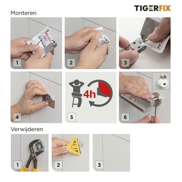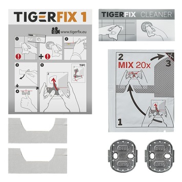 Tigerfix is vernieuwd en zorgt voor een zeer sterke bevestiging aan de wand. Tigerfix kan eenvoudig bevestigd worden op alle gladde en stevige ondergronden. Let op, dit product kan niet gebruikt worden op: geoliede en/of gelakte oppervlaktes, gestucte wanden, tegelvloeren en behang. Zonder boren is dit artikel na 4 uur klaar voor gebruik. Tigerfix is ideaal in een niet eigen woning omdat het na gebruik gemakkelijk en zonder beschadigingen is te verwijderen. Tigerfix type 1 is te gebruiken voor de Tiger accessoire series: Boston, dock, Impuls, Items, Ivy, Noon, Onu, Puck, Ramos, Safira en Urban. Op alle verpakkingen van Tiger badkameraccessoires die met Tigerfix gemonteerd kunnen worden, staat vermeld welk type Tigerfix (type 1 of type 2) gebruikt dient te worden.