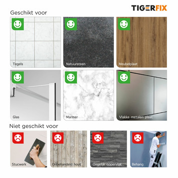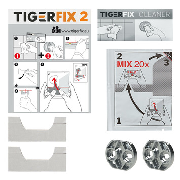 Tigerfix is vernieuwd en zorgt voor een zeer sterke bevestiging aan de wand. Tigerfix kan eenvoudig bevestigd worden op alle gladde en stevige ondergronden. Let op, dit product kan niet gebruikt worden op: geoliede en/of gelakte oppervlaktes, gestucte wanden, tegelvloeren en behang. Zonder boren is dit artikel na 4 uur klaar voor gebruik. Tigerfix is ideaal in een niet eigen woning omdat het na gebruik gemakkelijk en zonder beschadigingen is te verwijderen. Tigerfix type 2 is te gebruiken voor de Tiger accessoire series: Figueras, Melbourne, Ontario, Bold, Nomad, Lucca en Dante. Op alle verpakkingen van Tiger badkameraccessoires die met Tigerfix gemonteerd kunnen worden, staat vermeld welk type Tigerfix (type 1 of type 2) gebruikt dient te worden.
