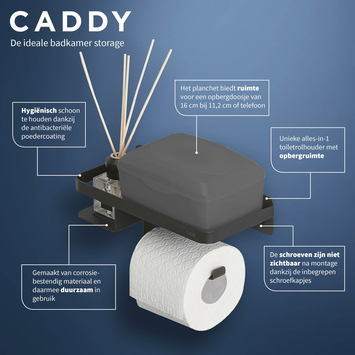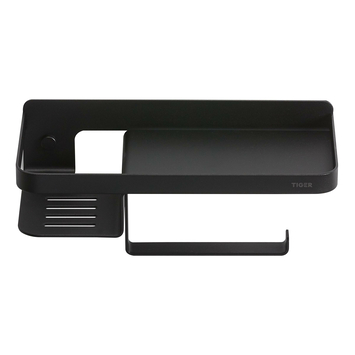 Je zit in één keer goed met deze unieke Tiger Caddy toiletrolhouder met planchet. Deze alles-in-1 toiletoplossing biedt ruimte voor geurstokjes, je mobiele telefoon, vochtig toiletpapier of zelfs een opbergdoosje voor hygiëne producten voor dames. Hij is de Houdini onder de badkameraccessoires, maar met de nieuwe Caddy is een opgeruimde badkamer geen illusie. Breng ook de elegante urban vibe naar jouw badkamer met deze variant in zwart.
