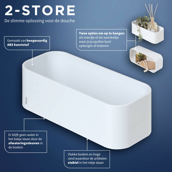 Schuif het bakje op het muurplaatje en je kunt altijd afwisselen. Het wandbakje is gemaakt van kunststof en kan dus niet roesten. Door de waterafloop onderin kun je het bakje gemakkelijk schoonhouden zodat het douchemandje jarenlang mooi blijft. De witte kleur geeft een licht en fris accent aan je badkamer en is makkelijk te combineren met andere accessoires.