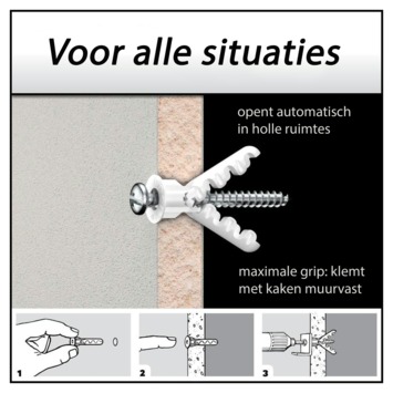 Bijt zich uitstekend vast in gips en holle muren. Echt de plug voor dit soort wanden.