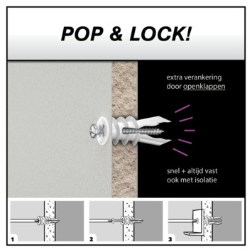 De Toggler-gipsplaatplug SPM-20 is geschikt voor montage in gipsplaat van 9,5mm, 12,5mm of 15mm dikte. De mini-gipsplaatplug monteer je snel en eenvoudig, omdat deze zelfborend en zelfborgend is. Voorboren is dus niet nodig. Je gebruikt een schroef van 3,5mm bij 4mm dikte en een minimale lengte van 25mm plus de materiaaldikte. Voor montage van deze schroef gebruik je een schroevendraaier of hetzelfde bitje als je voor montage van de SPM-plug gebruikt. Zodra de gipsplaatplug in de wand is geplaatst, klapt deze open achter de gipsplaat. Dit zorgt voor een extra stevige bevestiging van verschillende voorwerpen met een maximaal gewicht van 120kg, afhankelijk van het materiaal waarin je monteert. Denk aan schilderijen, spiegels of flatscreens. Deze verpakking bevat in totaal 20 SP-mini-gipsplaatpluggen van Toggler.