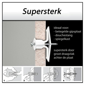 De Toggler-hollewandplug TC van 16mm tot 19mm, 6 stuks, gebruik je voor het bevestigen van voorwerpen in plaatmateriaal, zoals hout of kunststof van 16mm tot 19mm dik. Een hollewandplug (tuimelplug) heeft grote anti-rotatievleugels waardoor de plug niet meedraait wanneer je een schroef aandraait. Draai hier voldraadschroeven van 3,5mm tot 6mm dikte en een minimale lengte van 30mm in plus de dikte van het materiaal. Je gebruikt een boormaat van 8mm en mag de hollewandplug belasten met maximaal 80kg. De verpakking bevat 6 TC-hollewandpluggen van Toggler.