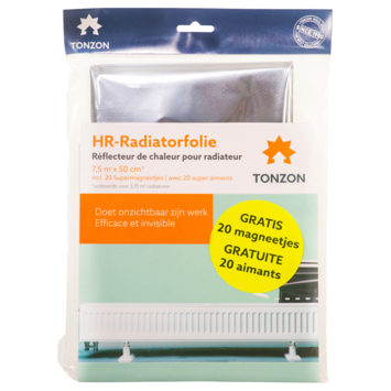 "Tonzon HR-radiator folie is super dunne folie. Zo dun als aluminium-folie. Grote verschil tov standaard radiatorfolie is dat je het aanbrengt op de radiator i.p.v. op de muur. Hierdoor kan het onzichtbaar worden aangebracht. Het is eenvoudig te installeren met de meegeleverde supermagneetjes. 96% Van de stralingswarmte aan de achterzijde van de radiator wordt teruggekaatst. Hierdoor wordt muur achter de radiator nagenoeg niet warm. Dit bespaart veel energie. T.o.v. standaard radiatorfolie is de investering per m² iets hoger. De besparing is ook hoger. Voor beide geldt dat je het binnen een jaar terugverdiend."