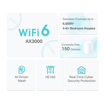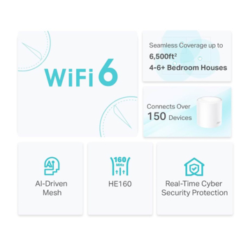 Deze Deco X50 beschikt over Wi-Fi 6 (AX). Hierdoor is je netwerk stabieler, sneller bij een groot aantal verbonden toestellen en energiezuiniger voor al je apparaten. Dit is met name handig voor drukke huishoudens waar veel mobiele apparaten gebruikt worden. Deco mesh WiFi is voor het hele huis ontworpen om een enorme boost te geven in dekking, snelheid en totale capaciteit. Gebruik de nieuwste mesh-wifi om te genieten van het toekomstige netwerk dat sneller laadt en meer verbinding maakt.
