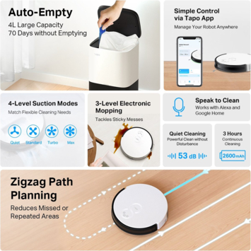 De TP-Link Tapo RV10 Plus is een Robotstofzuiger met dweilfunctie + leegstation - 4L stofzak met de Tapo RV10 Plus robotstofzuiger kun je zowel stofzuigen als dweilen. Het leegstation met 4L inhoud zorgt ervoor dat je niet na iedere schoonmaakbeurt het leegstation leeg hoeft te maken.
