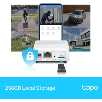 De Tapo H200 Smart Hub fungeert als het centrum van je Tapo Smart Home en maakt het mogelijk om beelden van Tapo-camera's en videodeurbellen op te slaan op een microSD-kaart (tot 512 GB, niet meegeleverd). Deze hub ondersteunt de verbinding van tot 64 schakelaars, sensoren of knoppen en 4 camera's of deurbellen, waarmee je een uitgebreid smart-ecosysteem kunt creëren. Het werkt samen met producten zoals de Tapo C420, Tapo C400 en Tapo D230.
