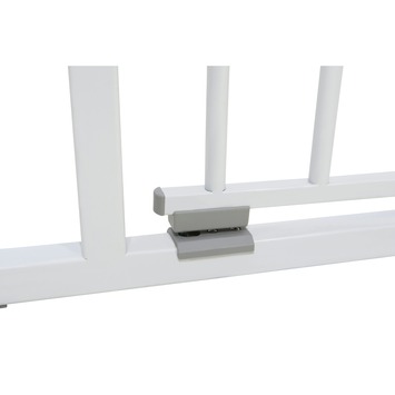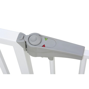 Het traphek heeft een dubbele beveiliging tegen openen, maar kan gemakkelijk met één handbeweging door een volwassene worden geopend en gesloten.