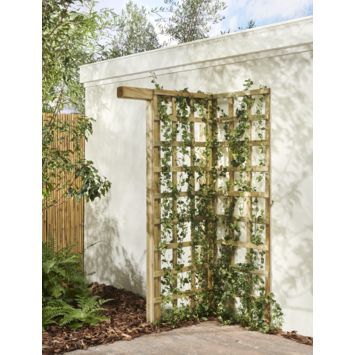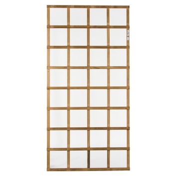 Met het trellis hardhout scherm is eenvoudig en snel een mooi rek te maken om klimplanten te ondersteunen. Ook is het ideaal om te gebruiken om speelse doorkijkjes te maken in een verder afgesloten schutting. Het rek is 180 cm hoog, 90 cm breed en heeft een dikte van 3 cm.