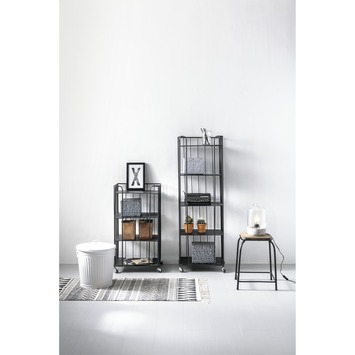 Dit robuuste fraaie verrijdbaar metalen wandrek (trolley) op zwenkwieltjes met 4 metalen legplanken is in het zwart gelakt. Afmeting (hxbxd): 91x48x37 cm. Dit verrijdbare metalen rek past vrijwel in elk interieur en is een mooie combinatie met de hogere uitvoering van 142 cm. Dit metalen wandrek is ook in de kleur wit verkrijgbaar.