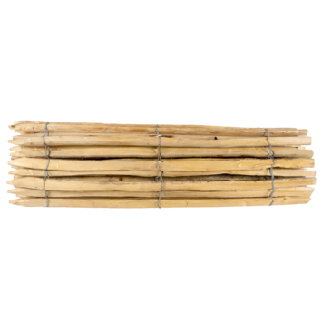 Het hek is opgebouwd uit gepunte kastanje latten die op drie punten aan elkaar zijn bevestigd met gevlochten verzinkte ijzerdraad. Deze constructie maakt het hek stevig maar toch flexibel, zodat het eenvoudig kan worden aangepast aan de vormen en contouren van uw tuin. Het natuurlijke materiaal geeft het geheel een rustieke en harmonieuze uitstraling die mooi samengaat met planten en andere tuinmaterialen.