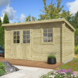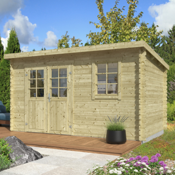 Tuinhuis Danna is een praktische en royale blokhut met een moderne uitstraling. Achter de afsluitbare dubbele deur met lage dorpel is bergruimte voor waardevolle spullen en/of tuingereedschap.
