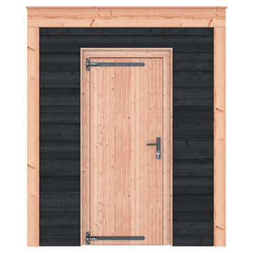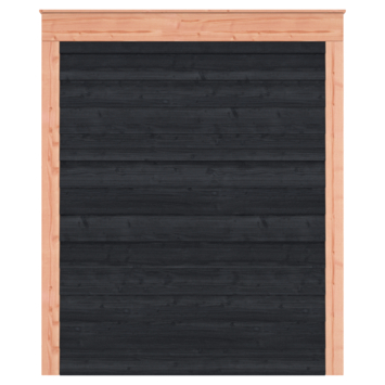De wanden zijn afgewerkt met zwart Zweeds rabat en de draagconstructie bestaat uit onbehandeld Douglas hout met staanders van 12 x 12 cm. Het platte dak en de strakke lijnen zorgen voor een overzichtelijk geheel. De enkele deur maakt het tuinhuis eenvoudig toegankelijk.