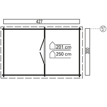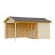 Blokhut Hazelaar met overkapping van Noord Europees vurenhout, wanddikte 28mm. Overkapping is voorzien van verstelbare paalvoet en samen met dubbele deur naar keuze links of rechts aan te bouwen. Afmeting 427x300x250cm (bxdxh*). Dubbele deur (138x174cm) met kunststofglas. Dakhout met messing en groef in 16mm dikte. Een houten vloer met messing en groef in 19mm dikte en voorzien van geïmpregneerde vloerbalken (40x60mm) is optioneel bestelbaar. Deze stapelbouw blokhut is voorzien van de zeer sterke en stabiele 4 plus hoekverbinding en wordt standaard geleverd inclusief dakleer, dakverankering, hang en sluitwerk en een duidelijke opbouwbeschrijving.