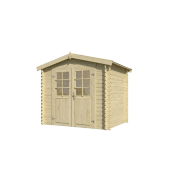 Het tuinhuis heeft een traditioneel zadeldak en wordt standaard geleverd met een bitumen dakbedekking. Wil je het dak extra beschermen, dan kun je dakshingles toevoegen. De zijwanden zijn 193,8 cm hoog en de nokhoogte is 222 cm. Zo heb je genoeg ruimte om rechtop te staan. Het geschaafde vurenhout is nog onbehandeld en kun je naar wens beitsen of verven.