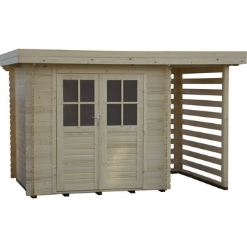 Tuinhuis Kervel 318x200 cm is gemaakt van Noord-Europees vurenhout. De blokhut is 2,02 meter hoog, 3,41 meter breed, 2 meter lang en een wanddikte van 18 mm. De overkapping is afgewerkt met horizontale planken en de dubbele deur is voorzien van kunststofglas. Het dakhout van messing en een groef is 15 millimeter dik. De standaard meegeleverde houten vloer met messing en groef heeft een dikte van 15mm. Bovendien is deze blokhut voorzien van geïmpregneerde vloerbalken (40x60mm). Deze stapelbouw blokhut wordt standaard geleverd inclusief dakleer, hang en sluitwerk en een duidelijke opbouwbeschrijving.