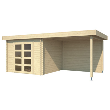 Het tuinhuis Krystina is een tuinhuis gemaakt van vurenhout. De totale lengte is 604 cm en de breedte is 315 cm aan de buitenzijde. De wanden zijn 28 mm dik en het hoogste punt van deze blokhut is 239 cm. De totale oppervlakte is 15,4 vierkante meter. Dit blokhut is makkelijk op te bouwen door de stapelbouwmethode. Hierdoor is tuinhuis Timian ideaal als een schuur, opbergruimte of een extra werkruimte. Het tuinhuis heeft veel lichtinval dankzij de dubbele deuren, voorzien van glas. Het tuinhuis wordt geleverd met een cilinderslot en is hierdoor veilig af te sluiten.Het platte dak helt met een heel lichte hoek met een kleine overstek voor de afwatering en wordt geleverd met een dakbedekking van asfaltvlies zodat het tuinhuis waterdicht is.