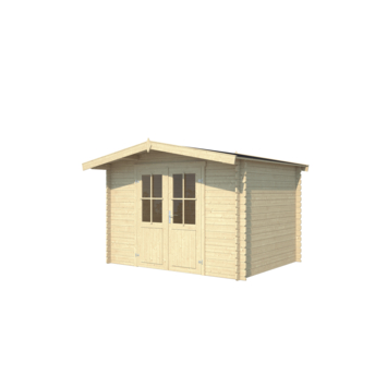 Tuinhuis Mark 292x230cm onbehandeld vuren is een praktische en royale blokhut met een traditionele uitstraling. Achter de afsluitbare dubbele deur met lage dorpel is bergruimte voor waardevolle spullen en/of tuingereedschap.