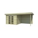 Het hout dat je gebruikt voor deze houten schuur heeft een gedompelde (geïmpregneerde) afwerking. Daardoor ontstaat er een groene gloed op het hout. Geïmpregneerd hout is een mooie tussenweg. Het heeft minder onderhoud nodig dan onbehandeld hout, maar meer dan hout met een coating. Geïmpregneerd hout heeft zelf al een nabehandeling gehad, maar het hout moet elke 3-5 jaar weer even opnieuw bijgewerkt worden met beits. Je wilt zowel de binnen- als de buitenkant goed behandelen. De extra aandacht kun je besteden aan de ramen en deuren. Die zijn namelijk het meest kwetsbaar.