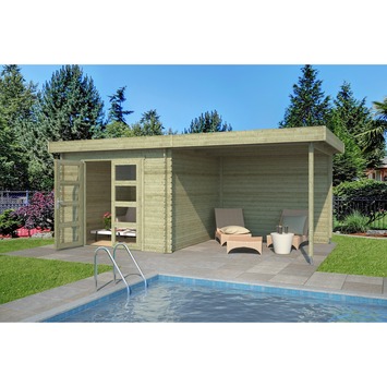 Dit tuinhuis is een multifunctionele berging met overkapping. De overkapping heeft een achterwand en zorgt daardoor meteen voor wat extra privacy. De berging die je zowel links- als rechts op kan bouwen, de keuze is aan jou, zorgt voor een opbergruimte waarin je al jouw tuinspullen droog kunt bewaren. De tuinkussens liggen voortaan nooit meer binnen in de weg. Het hout is een krachtig en robuust vurenhout. Dit hout is nog onbehandeld en vergt dus nog een beetje werk. De dubbele deur in de berging heeft ruiten van echt glas en een cilinderslot. Je spullen liggen niet alleen droog, maar ook veilig. Het lessenaarsdak voert eventueel regenwater netjes naar de achterzijde van het hutje. Ook wordt dit Tuinhuis met Overkapping Birgitta Gedompeld Hout 315x604 cm geleverd met asfaltvlies om het dak waterdicht te maken.