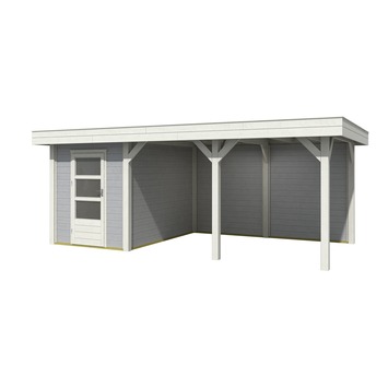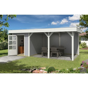 Tuinverblijf Borneo is een overkapping met berging en is gemaakt van Noord-Europees vurenhout. De dakmaat is 638x354 cm, het platte dak wordt afgewerkt met hoogwaardig EPDM rubberfolie en het regenwater wordt afgevoerd middels een dakdoorvoer en afvoerpijp. De massieve staanders met een dikte van 12x12 cm en de 2,8 cm dikke geveldelen geven de overkapping een stoer en robuust uiterlijk. Deze overkapping is 243 cm hoog en geeft je een prachtige ruimte om onder te verblijven. De bergruimte en de wandelementen zorgen voor een beschutte plek en privacy. Kortom: dit Tuinhuis met Tuinhuis met Overkapping Borneo Gecoat Hout Grijs 638x354 cm is een functionele opbergruimte, met een overkapping en voldoende privacy.