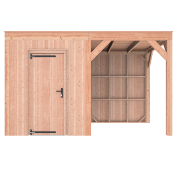 Dit modern vormgegeven tuinverblijf biedt een perfecte balans tussen uitstraling en functionaliteit. De totale afmetingen zijn 245 cm hoog, 395 cm breed en 255 cm diep. De berging heeft een breedte van 178,5 cm met een deur van 75cm x192,5cm.De overkapping heeft een breedte van 178,5 cm en een doorloophoogte van 224 cm.Of je nu een gezellige loungehoek, een opslagruimte of een overdekte plek voor tuinfeestjes zoekt, dit Douglas tuinverblijf is een aanwinst voor iedere tuin.Natuurlijke uitstraling, degelijke kwaliteit.De wanden zijn bekleed met Half houts rabat en de constructie is gemaakt van onbehandeld Douglas met stevige staanders van 12x12cm.De keuze voor onbehandeld Douglas hout biedt een authentieke uitstraling en staat ook garant voor een lange levensduur.Functies:Door een overkapping mét opslag te kiezen, heb je een praktische ruimte om bijvoorbeeld tuingereedschap of fietsen op te slaan en af te sluiten, maar ook voor een ruimte om heerlijk beschut te ontspannen in uw eigen tuin. Het beste van 2 werelden!Klaar voor een groene toekomst:Dit modern vormgegeven tuinverblijf is speciaal ontworpen om zonnepanelen of een sedum dak te kunnen ondersteunen, Hierdoor is dit verblijf een duurzame en milieuvriendelijke aanvulling op uw tuin is.Zelf aan de slagDankzij de duidelijke opbouwomschrijving, meegeleverde bevestigingsmaterialen en op maat gezaagde onderdelen, is de installatie van dit tuinhuis een haalbare klus voor iedere gemiddelde doe-het-zelver. Dak bekleding:Wij raden aan om deze Douglas overkapping te voorzien van een EPDM Dak bekleding voor een lekvrij dak (Let op: los bij te bestellen).Onderhoud:Bij het kopen van een overkapping is onderhoud een aandachtspunt… Met Douglas hout heb je het goed voor elkaar, Douglas is namelijk van zichzelf al een sterke houtsoort. Het gaat zonder extra behandeling eenvoudig 10 tot 15 jaar mee. Om de maximale levensduur te verlengen kun je gebruik maken van speciale Douglas beits of Douglas olie en elke 2 jaar opnieuw beitsen of oliën.