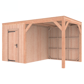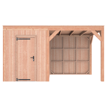 Dit modern vormgegeven tuinverblijf biedt een perfecte balans tussen uitstraling en functionaliteit. De totale afmetingen zijn 245 cm hoog, 445 cm breed en 255 cm diep. De berging heeft een breedte van 228,5 cm met een deur van 75cm x192,5cm.De overkapping heeft een breedte van 178,5 cm en een doorloophoogte van 224 cm.Of je nu een gezellige loungehoek, een opslagruimte of een overdekte plek voor tuinfeestjes zoekt, dit Douglas tuinverblijf is een aanwinst voor iedere tuin.Natuurlijke uitstraling, degelijke kwaliteit.De wanden zijn bekleed met Half houts rabat en de constructie is gemaakt van onbehandeld Douglas met stevige staanders van 12x12cm.De keuze voor onbehandeld Douglas hout biedt een authentieke uitstraling en staat ook garant voor een lange levensduur.Functies:Door een overkapping mét opslag te kiezen, heb je een praktische ruimte om bijvoorbeeld tuingereedschap of fietsen op te slaan en af te sluiten, maar ook voor een ruimte om heerlijk beschut te ontspannen in uw eigen tuin. Het beste van 2 werelden!Klaar voor een groene toekomst:Dit modern vormgegeven tuinverblijf is speciaal ontworpen om zonnepanelen of een sedum dak te kunnen ondersteunen, Hierdoor is dit verblijf een duurzame en milieuvriendelijke aanvulling op uw tuin is.Zelf aan de slagDankzij de duidelijke opbouwomschrijving, meegeleverde bevestigingsmaterialen en op maat gezaagde onderdelen, is de installatie van dit tuinhuis een haalbare klus voor iedere gemiddelde doe-het-zelver. Dak bekleding:Wij raden aan om deze Douglas overkapping te voorzien van een EPDM Dak bekleding voor een lekvrij dak (Let op: los bij te bestellen).Onderhoud:Bij het kopen van een overkapping is onderhoud een aandachtspunt… Met Douglas hout heb je het goed voor elkaar, Douglas is namelijk van zichzelf al een sterke houtsoort. Het gaat zonder extra behandeling eenvoudig 10 tot 15 jaar mee. Om de maximale levensduur te verlengen kun je gebruik maken van speciale Douglas beits of Douglas olie en elke 2 jaar opnieuw beitsen of oliën.