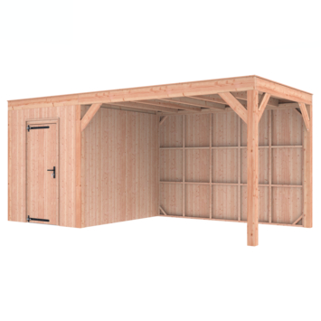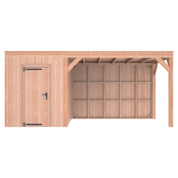 Dit modern vormgegeven tuinverblijf biedt een perfecte balans tussen uitstraling en functionaliteit. De totale afmetingen zijn 245 cm hoog, 545 cm breed en 255 cm diep. De berging heeft een breedte van 328,5 cm met een deur van 75cm x192,5cm.De overkapping heeft een breedte van 178,5 cm en een doorloophoogte van 224 cm.Of je nu een gezellige loungehoek, een opslagruimte of een overdekte plek voor tuinfeestjes zoekt, dit Douglas tuinverblijf is een aanwinst voor iedere tuin.Natuurlijke uitstraling, degelijke kwaliteit.De wanden zijn bekleed met Half houts rabat en de constructie is gemaakt van onbehandeld Douglas met stevige staanders van 12x12cm.De keuze voor onbehandeld Douglas hout biedt een authentieke uitstraling en staat ook garant voor een lange levensduur.Functies:Door een overkapping mét opslag te kiezen, heb je een praktische ruimte om bijvoorbeeld tuingereedschap of fietsen op te slaan en af te sluiten, maar ook voor een ruimte om heerlijk beschut te ontspannen in uw eigen tuin. Het beste van 2 werelden!Klaar voor een groene toekomst:Dit modern vormgegeven tuinverblijf is speciaal ontworpen om zonnepanelen of een sedum dak te kunnen ondersteunen, Hierdoor is dit verblijf een duurzame en milieuvriendelijke aanvulling op uw tuin is.Zelf aan de slagDankzij de duidelijke opbouwomschrijving, meegeleverde bevestigingsmaterialen en op maat gezaagde onderdelen, is de installatie van dit tuinhuis een haalbare klus voor iedere gemiddelde doe-het-zelver. Dak bekleding:Wij raden aan om deze Douglas overkapping te voorzien van een EPDM Dak bekleding voor een lekvrij dak (Let op: los bij te bestellen).Onderhoud:Bij het kopen van een overkapping is onderhoud een aandachtspunt… Met Douglas hout heb je het goed voor elkaar, Douglas is namelijk van zichzelf al een sterke houtsoort. Het gaat zonder extra behandeling eenvoudig 10 tot 15 jaar mee. Om de maximale levensduur te verlengen kun je gebruik maken van speciale Douglas beits of Douglas olie en elke 2 jaar opnieuw beitsen of oliën.