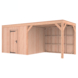 Dit modern vormgegeven tuinverblijf biedt een perfecte balans tussen uitstraling en functionaliteit. De totale afmetingen zijn 245 cm hoog, 595 cm breed en 255 cm diep. De berging heeft een breedte van 278,5 cm met een deur van 75cm x192,5cm.De overkapping heeft een breedte van 278,5 cm en een doorloophoogte van 224 cm.Of je nu een gezellige loungehoek, een opslagruimte of een overdekte plek voor tuinfeestjes zoekt, dit Douglas tuinverblijf is een aanwinst voor iedere tuin.Natuurlijke uitstraling, degelijke kwaliteit.De wanden zijn bekleed met Half houts rabat en de constructie is gemaakt van onbehandeld Douglas met stevige staanders van 12x12cm.De keuze voor onbehandeld Douglas hout biedt een authentieke uitstraling en staat ook garant voor een lange levensduur.Functies:Door een overkapping mét opslag te kiezen, heb je een praktische ruimte om bijvoorbeeld tuingereedschap of fietsen op te slaan en af te sluiten, maar ook voor een ruimte om heerlijk beschut te ontspannen in uw eigen tuin. Het beste van 2 werelden!Klaar voor een groene toekomst:Dit modern vormgegeven tuinverblijf is speciaal ontworpen om zonnepanelen of een sedum dak te kunnen ondersteunen, Hierdoor is dit verblijf een duurzame en milieuvriendelijke aanvulling op uw tuin is.Zelf aan de slagDankzij de duidelijke opbouwomschrijving, meegeleverde bevestigingsmaterialen en op maat gezaagde onderdelen, is de installatie van dit tuinhuis een haalbare klus voor iedere gemiddelde doe-het-zelver. Dak bekleding:Wij raden aan om deze Douglas overkapping te voorzien van een EPDM Dak bekleding voor een lekvrij dak (Let op: los bij te bestellen).Onderhoud:Bij het kopen van een overkapping is onderhoud een aandachtspunt… Met Douglas hout heb je het goed voor elkaar, Douglas is namelijk van zichzelf al een sterke houtsoort. Het gaat zonder extra behandeling eenvoudig 10 tot 15 jaar mee. Om de maximale levensduur te verlengen kun je gebruik maken van speciale Douglas beits of Douglas olie en elke 2 jaar opnieuw beitsen of oliën.