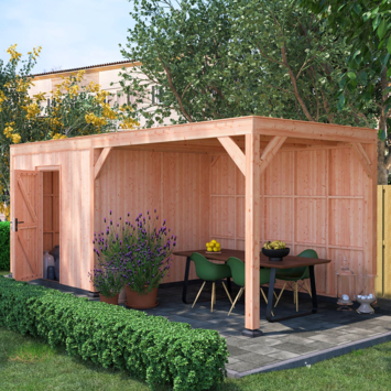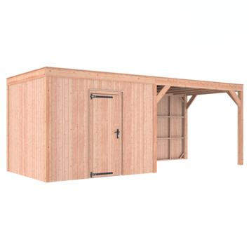 Dit modern vormgegeven tuinverblijf biedt een perfecte balans tussen uitstraling en functionaliteit. De totale afmetingen zijn 245 cm hoog, 645 cm breed en 255 cm diep. De berging heeft een breedte van 328,5 cm met een deur van 75cm x192,5cm.De overkapping heeft een breedte van 278,5 cm en een doorloophoogte van 224 cm.Of je nu een gezellige loungehoek, een opslagruimte of een overdekte plek voor tuinfeestjes zoekt, dit Douglas tuinverblijf is een aanwinst voor iedere tuin.Natuurlijke uitstraling, degelijke kwaliteit.De wanden zijn bekleed met Half houts rabat en de constructie is gemaakt van onbehandeld Douglas met stevige staanders van 12x12cm.De keuze voor onbehandeld Douglas hout biedt een authentieke uitstraling en staat ook garant voor een lange levensduur.Functies:Door een overkapping mét opslag te kiezen, heb je een praktische ruimte om bijvoorbeeld tuingereedschap of fietsen op te slaan en af te sluiten, maar ook voor een ruimte om heerlijk beschut te ontspannen in uw eigen tuin. Het beste van 2 werelden!Klaar voor een groene toekomst:Dit modern vormgegeven tuinverblijf is speciaal ontworpen om zonnepanelen of een sedum dak te kunnen ondersteunen, Hierdoor is dit verblijf een duurzame en milieuvriendelijke aanvulling op uw tuin is.Zelf aan de slagDankzij de duidelijke opbouwomschrijving, meegeleverde bevestigingsmaterialen en op maat gezaagde onderdelen, is de installatie van dit tuinhuis een haalbare klus voor iedere gemiddelde doe-het-zelver. Dak bekleding:Wij raden aan om deze Douglas overkapping te voorzien van een EPDM Dak bekleding voor een lekvrij dak (Let op: los bij te bestellen).Onderhoud:Bij het kopen van een overkapping is onderhoud een aandachtspunt… Met Douglas hout heb je het goed voor elkaar, Douglas is namelijk van zichzelf al een sterke houtsoort. Het gaat zonder extra behandeling eenvoudig 10 tot 15 jaar mee. Om de maximale levensduur te verlengen kun je gebruik maken van speciale Douglas beits of Douglas olie en elke 2 jaar opnieuw beitsen of oliën.
