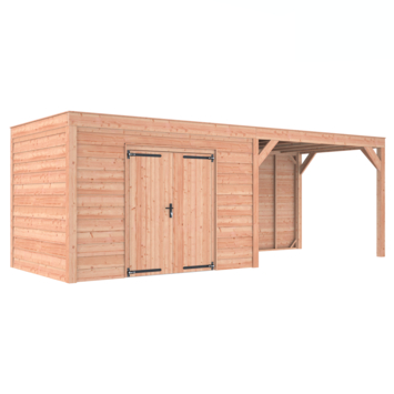 Dit modern vormgegeven tuinverblijf biedt een perfecte balans tussen uitstraling en functionaliteit. De totale afmetingen zijn 245 cm hoog, 695 cm breed en 255 cm diep. De berging heeft een breedte van 328,5 cm met een deur van 75cm x192,5cm.De overkapping heeft een breedte van 328,5 cm en een doorloophoogte van 224 cm.Of je nu een gezellige loungehoek, een opslagruimte of een overdekte plek voor tuinfeestjes zoekt, dit Douglas tuinverblijf is een aanwinst voor iedere tuin.Natuurlijke uitstraling, degelijke kwaliteit.De wanden zijn bekleed met Douglas Zweeds rabat en de constructie is gemaakt van onbehandeld Douglas met stevige staanders van 12x12cm.De keuze voor onbehandeld Douglas hout biedt een authentieke uitstraling en staat ook garant voor een lange levensduur.Functies:Door een overkapping mét opslag te kiezen, heb je een praktische ruimte om bijvoorbeeld tuingereedschap of fietsen op te slaan en af te sluiten, maar ook voor een ruimte om heerlijk beschut te ontspannen in uw eigen tuin. Het beste van 2 werelden!Klaar voor een groene toekomst:Dit modern vormgegeven tuinverblijf is speciaal ontworpen om zonnepanelen of een sedum dak te kunnen ondersteunen, Hierdoor is dit verblijf een duurzame en milieuvriendelijke aanvulling op uw tuin is.Zelf aan de slagDankzij de duidelijke opbouwomschrijving, meegeleverde bevestigingsmaterialen en op maat gezaagde onderdelen, is de installatie van dit tuinhuis een haalbare klus voor iedere gemiddelde doe-het-zelver. Dak bekleding:Wij raden aan om deze Douglas overkapping te voorzien van een EPDM Dak bekleding voor een lekvrij dak (Let op: los bij te bestellen).Onderhoud:Bij het kopen van een overkapping is onderhoud een aandachtspunt… Met Douglas hout heb je het goed voor elkaar, Douglas is namelijk van zichzelf al een sterke houtsoort. Het gaat zonder extra behandeling eenvoudig 10 tot 15 jaar mee. Om de maximale levensduur te verlengen kun je gebruik maken van speciale Douglas beits of Douglas olie en elke 2 jaar opnieuw beitsen of oliën.