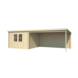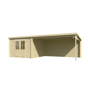 Deze blokhut met overkapping is voorzien van een schuin aflopend dak met de afwatering aan de achterzijde. Dit type blokhut met overkapping kan gespiegeld worden opgebouwd. In dat geval wordt het overkapte deel aan de linkerkant geplaatst en het dichte gedeelte rechts. De latten voor de 4-vlaks raamverdeling op de ruit in de deur worden los meegeleverd.