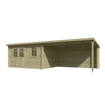Tuinhuis Joy 760 x 275 cm geïmpregneerd combineert een afgesloten berging met een ruime overkapping. Dit maakt het tuinhuis geschikt voor zowel opslag als een beschutte zitplek in de tuin.