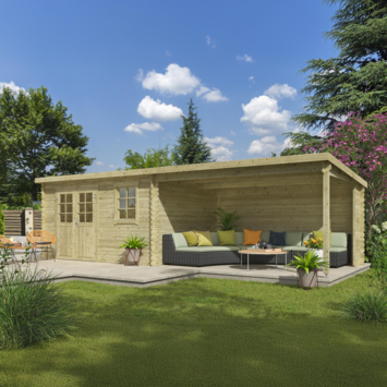 Het schuin aflopende dak zorgt voor een goede afwatering aan de achterzijde. De blokhut kan gespiegeld worden opgebouwd, zodat de indeling past bij jouw tuin. De dubbele deuren met glas laten veel daglicht binnen en zijn voorzien van losse latten voor raamverdeling. Het aanwezige draai-kiepraam biedt extra ventilatiemogelijkheden.
